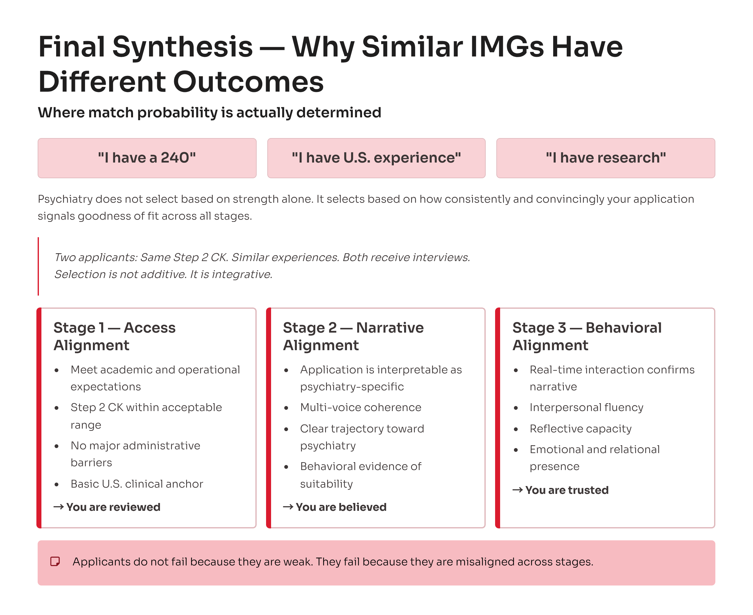 For international medical graduates (IMGs), the question is not simply whether psychiatry is IMG-friendly, but how IMGs successfully match into psychiatry—and why many do not. Match outcomes are not determined by a single metric, but by how an application moves through each stage of the residency selection process.